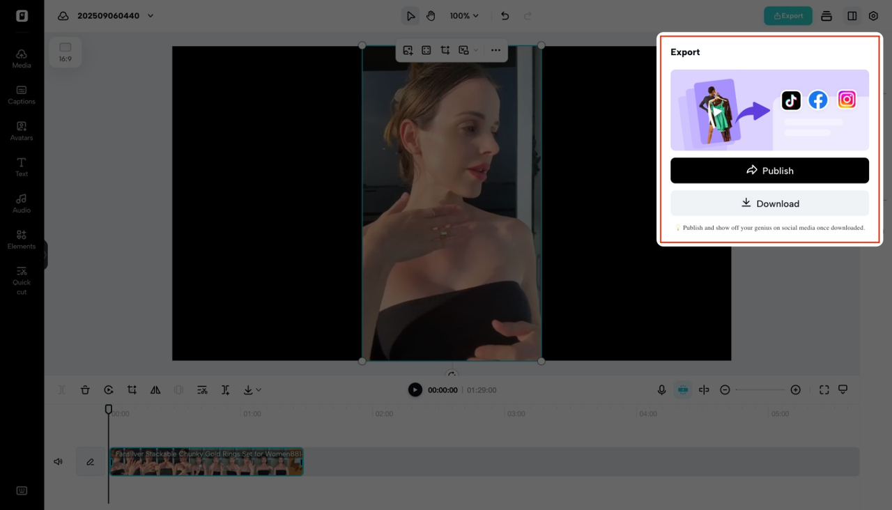 Dans le menu Légendes de gauche, choisissez Paroles automatiques. L'intelligence artificielle de Pippit reconnaît instantanément l'audio et génère des légendes ou des paroles parfaitement synchronisées. Cette fonction change la donne pour les vidéos musicales, les contenus de marque et même les bobines de narration. Examinez le texte, modifiez-le si nécessaire, puis cliquez sur Exporter. En quelques minutes, votre vidéo est prête pour Instagram, TikTok ou YouTube en haute résolution.