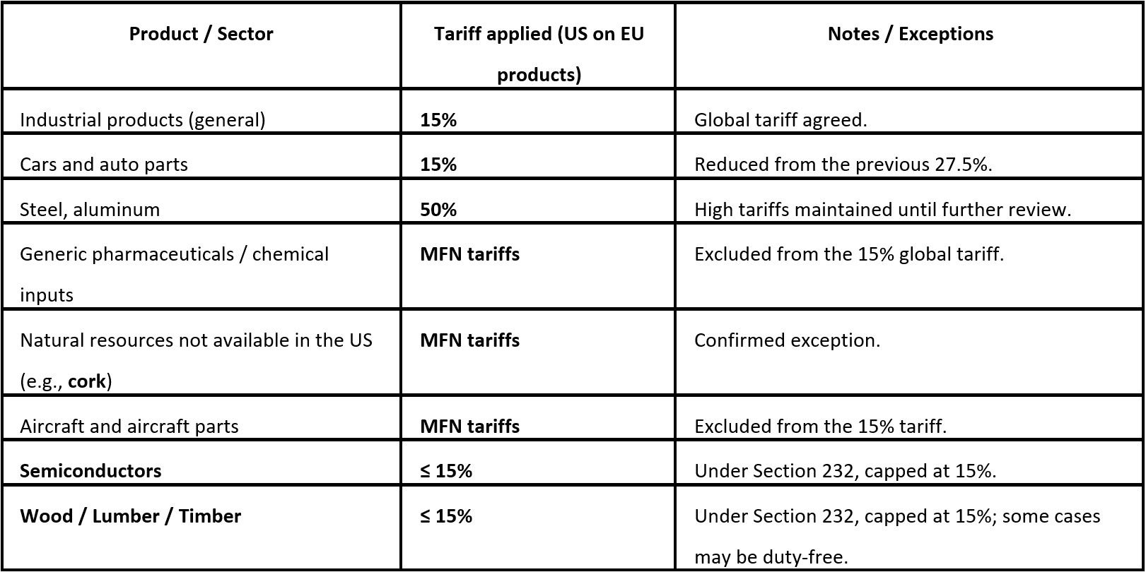 sui prodotti farmaceutici, i semiconduttori, il legname, le automobili e le parti di automobili dell'UE saranno ridotte in base al Quadro. Per l'acciaio, l'alluminio e i prodotti derivati, le parti esamineranno misure per gestire l'eccesso di capacità e garantire al contempo catene di approvvigionamento sicure.