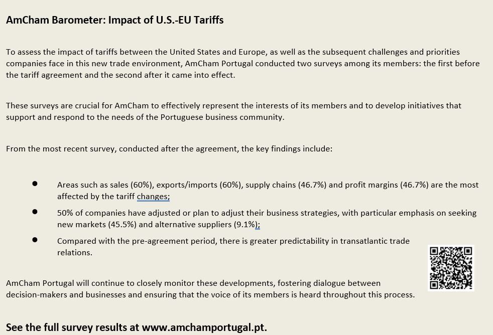 Per assicurarsi che le prospettive delle imprese portoghesi si riflettano pienamente nelle future discussioni e revisioni dell'accordo, l'AmCham ha lanciato un breve sondaggio per valutare l'impatto delle nuove tariffe, le sfide che esse creano e le priorità future. Le informazioni raccolte guideranno l'azione dell'AmCham, rafforzeranno la sua azione di advocacy per conto dei membri e aiuteranno a progettare iniziative che rispondano alle reali esigenze della comunità imprenditoriale portoghese.