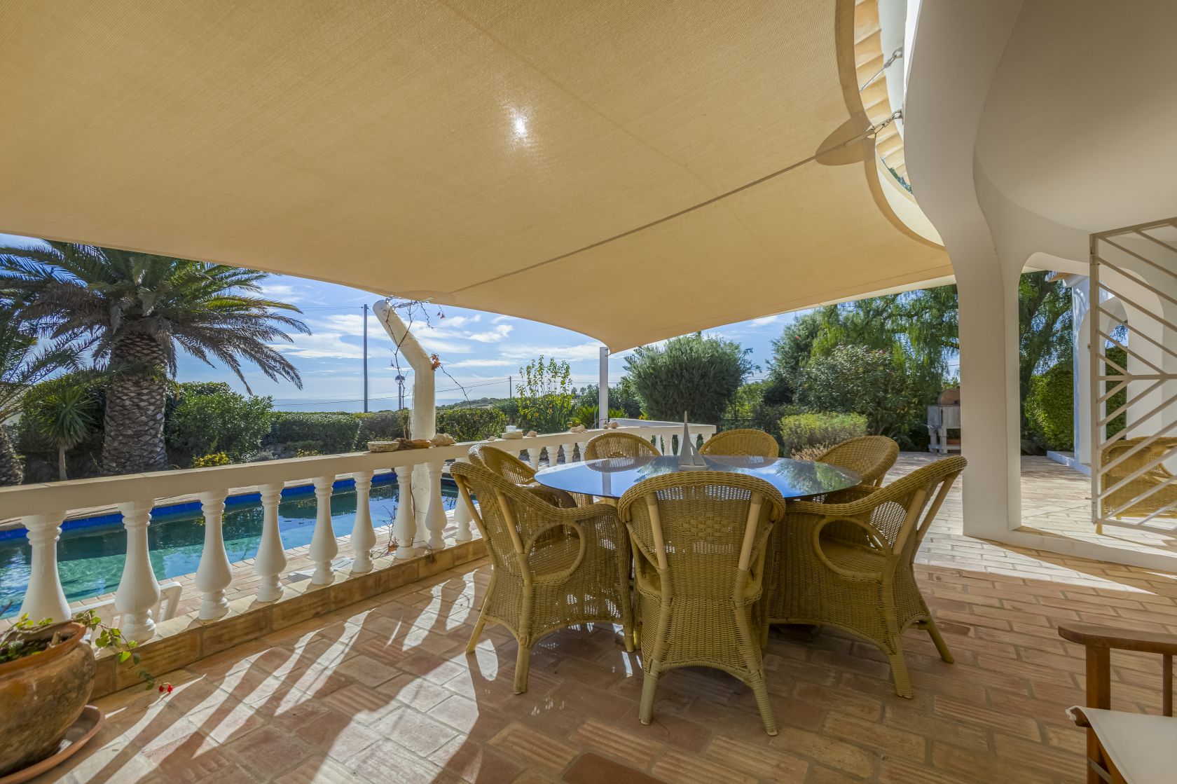 12 × 5 m swimming pool, surrounded by mature gardens and panoramic sea views — the perfect setting for quiet relaxation or entertaining friends and family outdoors.