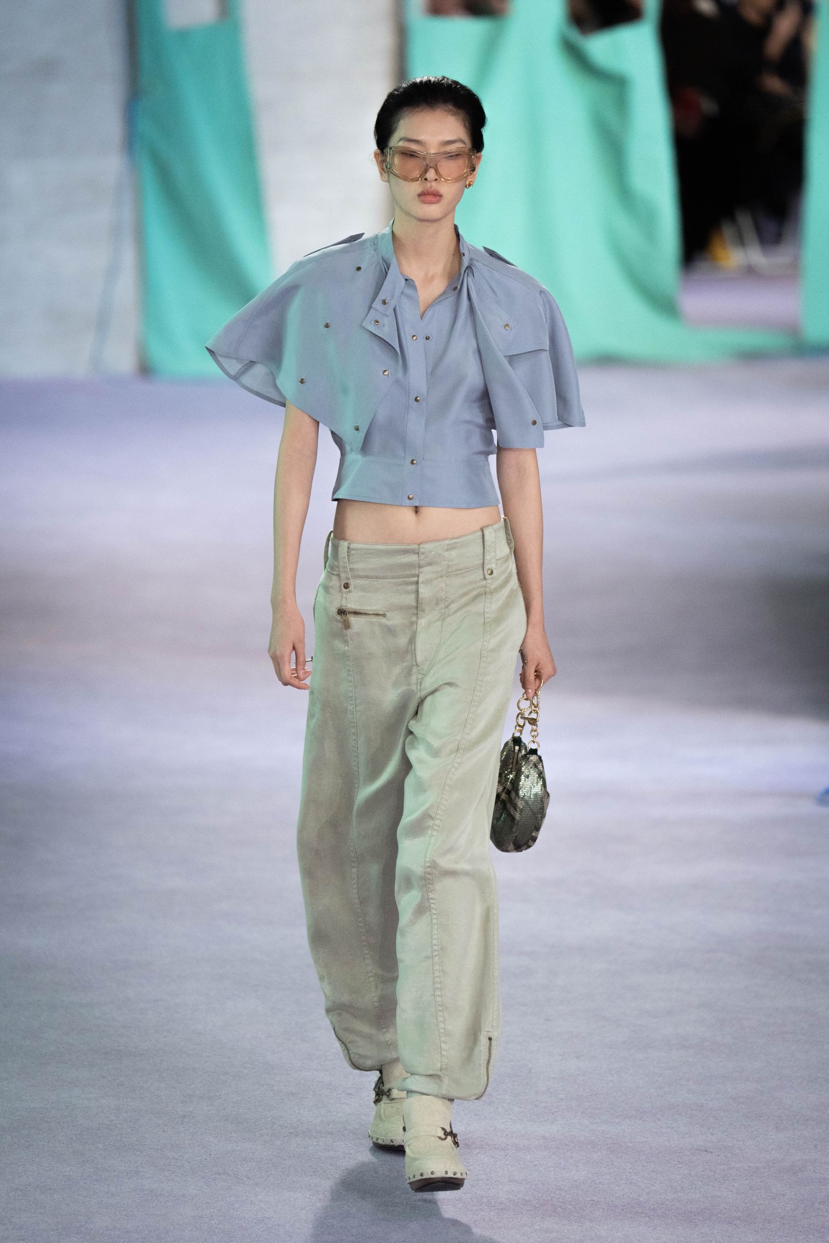 Dit betekent dat stoffen net zo belangrijk zijn als de vorm om je outfit niet te overspoelen. Een slanke rolkraag, A-lijn jeans en laarzen met hak helpen het topzware silhouet in balans te brengen.
