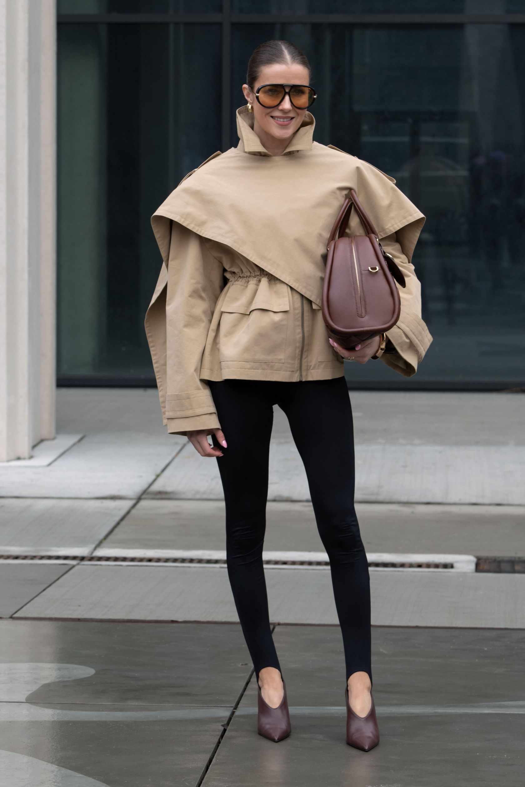 "Omdat een cape al volume heeft, is het belangrijk om de rest van de look strak en getailleerd te houden," legt ze uit. "Slanke broeken, kokerrokken of een nauwsluitend breisel eronder zullen de vorm mooi in balans brengen.