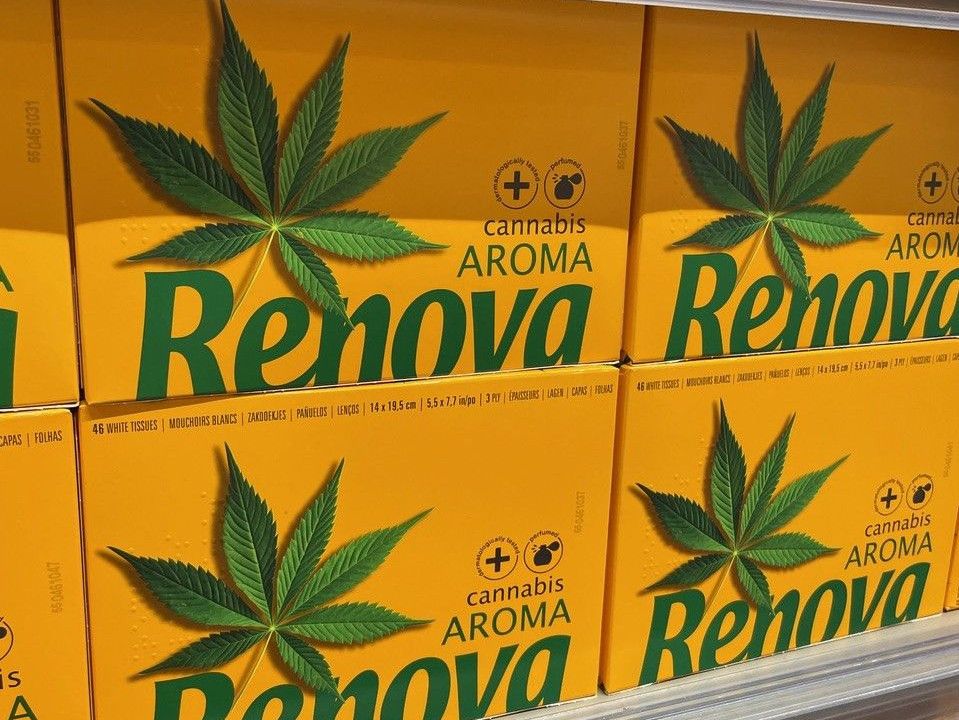 Nie dyskretna mała ikonka w rogu. Pełny liść konopi indyjskich, z przodu i na środku, promieniujący ziołową pewnością siebie z pudełka chusteczek Renova, sprzedawanego właśnie tutaj, w głównym supermarkecie w Portugalii. Mieszkałem w Portugalii przez ostatnie trzy lata i wydawało mi się, że widziałem już wiele dziwacznych marek w Euro - ale to była nowość.