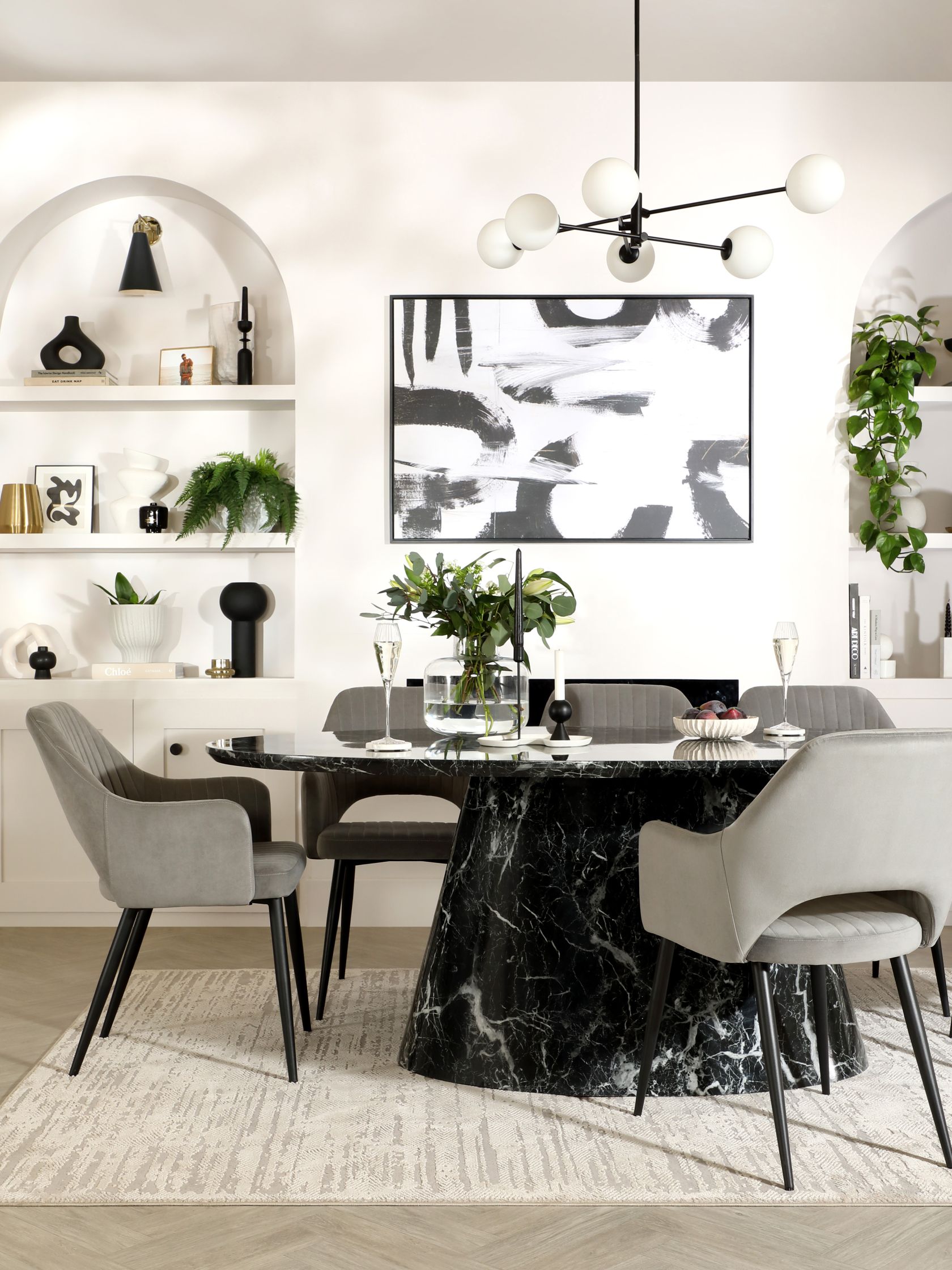 Обеденные столы в стиле середины века с коническими ножками, стеклянная посуда в винтажном стиле и эффектное освещение помогут Стрельцам создать идеальное пространство для праздничного приема гостей".